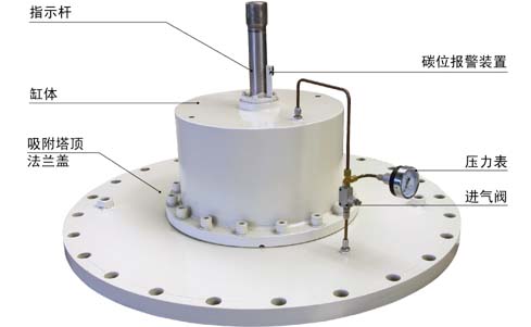 新型獨創的氣缸壓緊裝置,儀表氣直接取之于吸附塔,任何狀態下,氣缸內壓力始終為吸附塔的最高壓力,不受吸附塔內壓力變化的影響,確保分子篩始終處于被壓緊狀態。壓緊裝置中設置了限位沉降式報警系統,當氣缸活塞行程達到下限行程時,設備控制系統自動產生聲光報警;當氣缸活塞到達極限行程時,設備自動停機,等待檢修。本氣缸具有方便檢測,可靠性強等優點。
